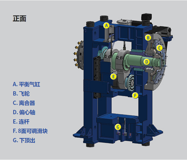 韩国热模锻压力机厂家同时采用内齿圈、离合器齿轮方式的离合器结构,使用了高扭矩能力和 多盘式类型来增大摩擦系数,将磨损降到低点。