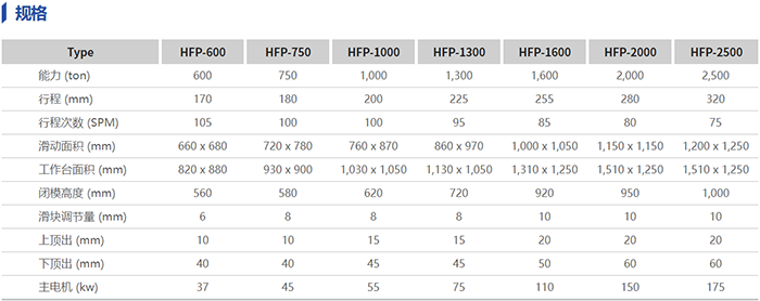 HFP系列是直驱方式驱动,适合生产多种形态的锻造产品的温、热锻压 机,全部机型都是采用高强度一体型焊接机身并插入预应拉杆,因此可 发挥设备强大的力量,同时可把延伸率减小,以高精度制作的滑块在 前后面可进行前、后、左、右调节的8面导轨实现了产品的高精度锻造。