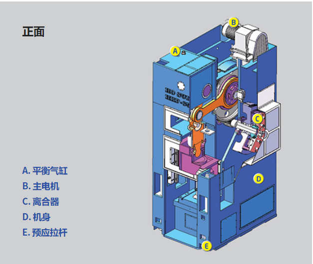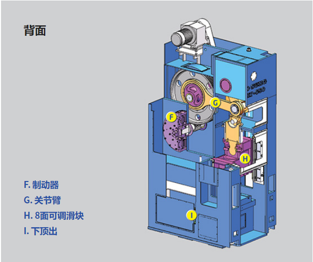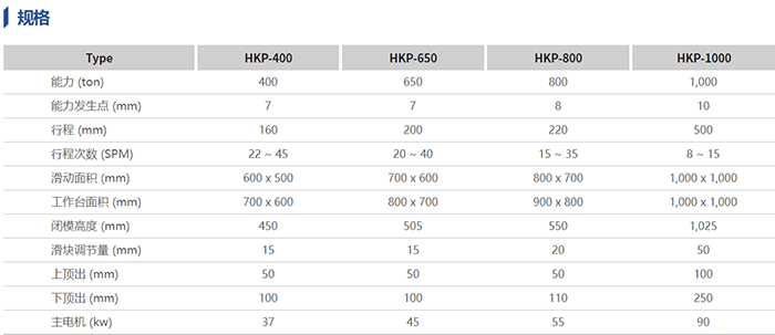 HKP冷锻压力机系列是以肘杆式机构方式驱动,因此滑块速度在 下止点附近放缓呈现独特的滑块运动曲线,不仅适合生 产精整、精压等精密压缩加工,也适合在低噪音、低震 动下生产冷锻产品的压力机。